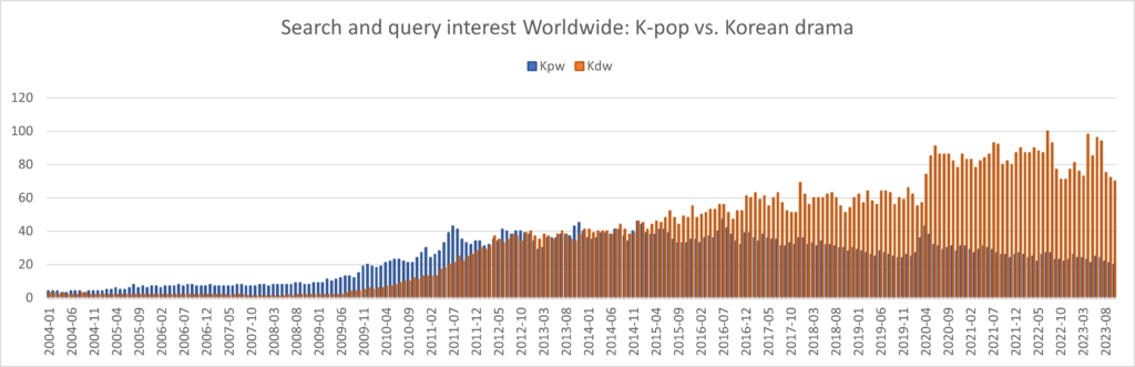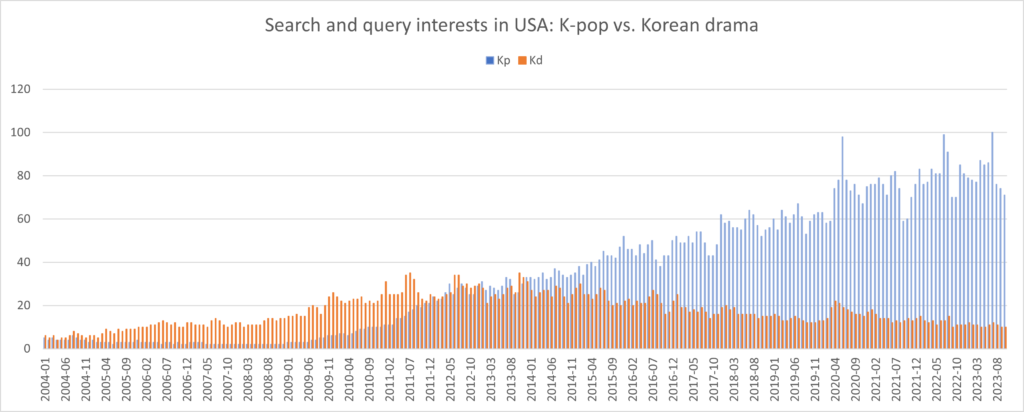 Note: Kp and Kd represent search and query interests for K-Pop and Korean drama in the USA. Kpw and Kdw represent search and query interests for K-pop and Korean drama worldwide